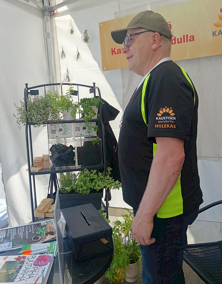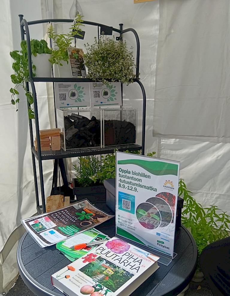 Infopisteellämme oli esillä biohiilen raaka-ainetta monessa muodossa, sekä valmista biohiiltä kahdessa eri muodossa. Lisäksi tutustuttavana oli biohiilen avulla kasvatettuja yrttejä ja puutarhakasveja. Reijo Virtanen kertoi biohiilitietoa teltalla koko viikon ajan. Arvontaan oli mahdollista osallistua biohiiliaiheiseen tietovisaan vastaamalla, palkintona oli upea puutarhakirja. Markkinoimme infopisteellä myös tulevaa tutustumismatkaa. Qr-koodin avulla kiinnostuneet voivat tutustua mm. julkaisemaamme sähköiseen infovihkoseen ja pyrolysointinäytöksesta tehtyyn tallenteeseen.