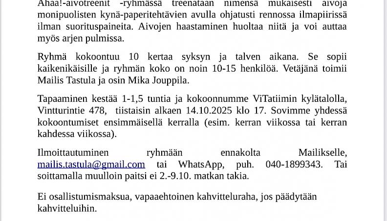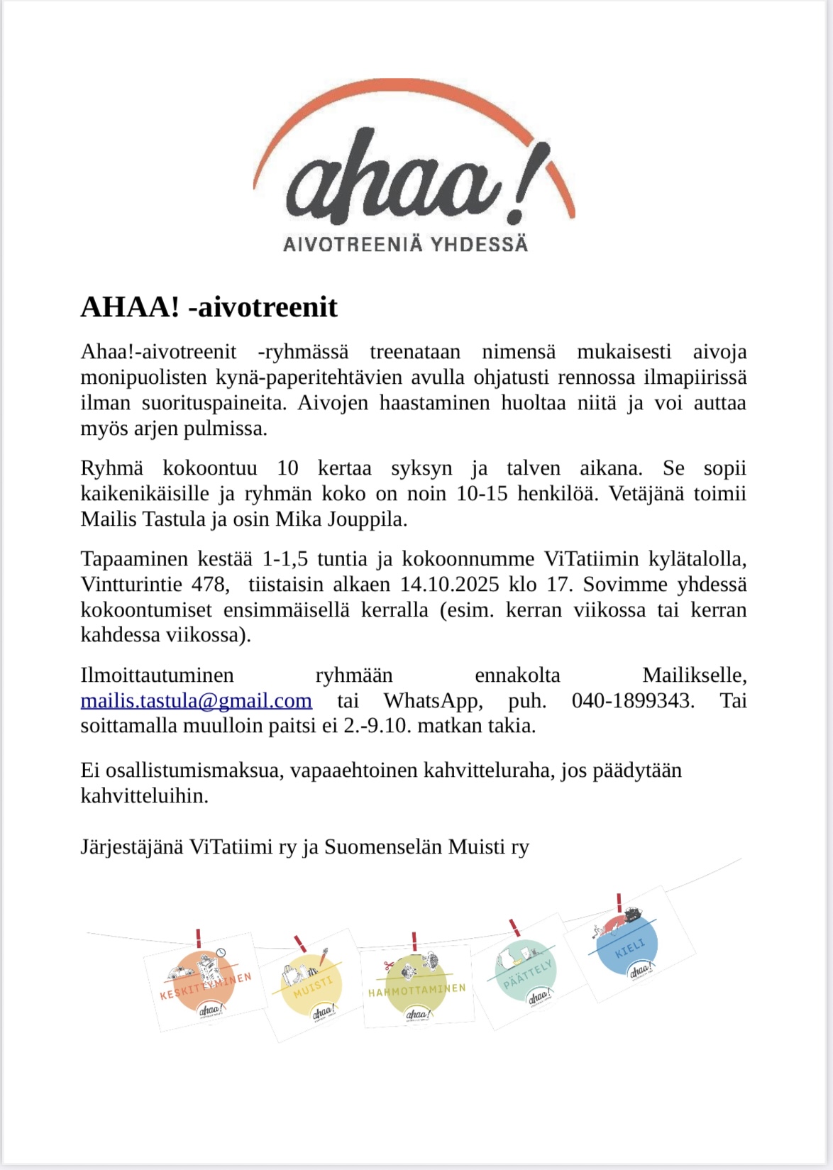 Ahaa!-aivotreenit -ryhmässä treenataan nimensä mukaisesti aivoja monipuolisten kynä-paperitehtävien avulla ohjatusti rennossa ilmapiirissä ilman suorituspaineita.