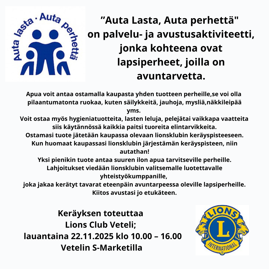 Vetelin Lions Club järjestää Auta lasta, Auta perhettä tavarakeräyksen Vetelin S-Marketilla. Osta yksi ylimääräinen tuote ja lahjoita se Lionsien keräyspisteeseen.