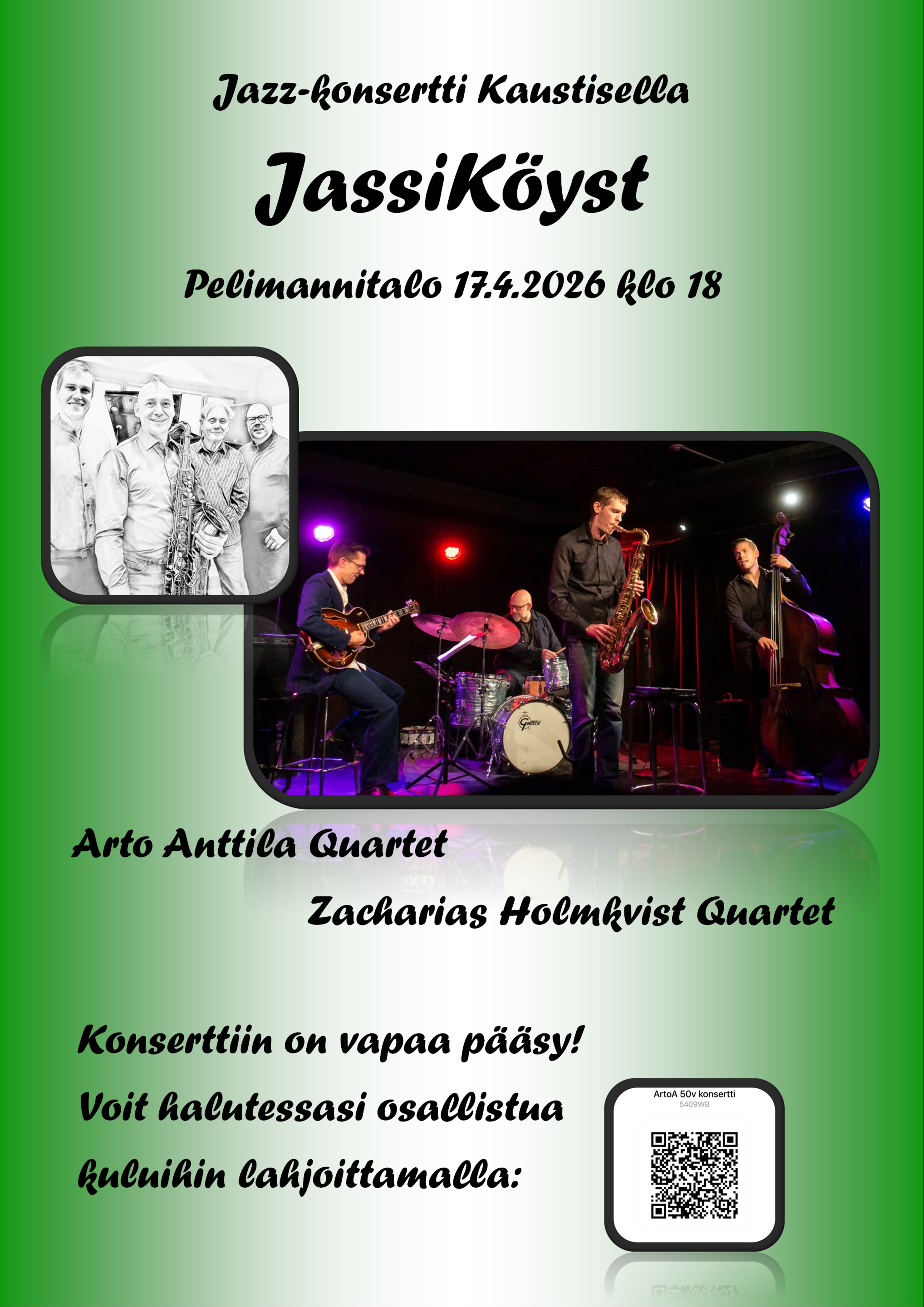Jazzkonsertti Kaustisen pelimannitalolla. Arto Anttila Quartet aloittaa, pääesiintyjänä Zacharias Holmkvist Quartet. Väliaikakaffit juhlan kunniaksi. Vapaa pääsy, mahdollisuus tukea tilaisuutta lahjoituksin.