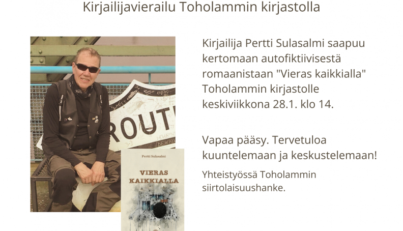 Kirjailija Pertti Sulasalmi saapuu keskustelemaan viime vuonna ilmestyneestä autofiktiivisestä romaanistaan "Vieras kaikkialla" keskiviikkona 28.1. klo 14. Tapahtuma järjestetään yhteistyössä Toholammin siirtolaisuushankkeen kanssa.