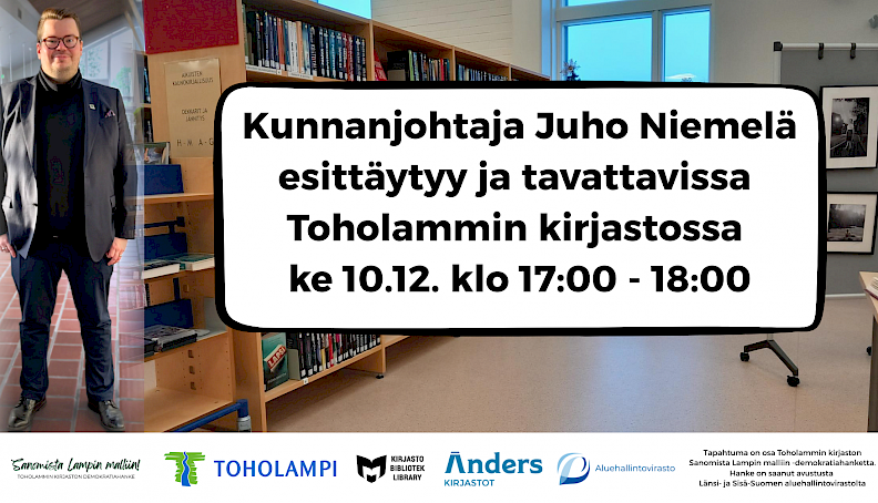 "Meet and greet", kohdataan ja tervehditään! Toholammin uusi kunnanjohtaja Juho Niemelä esittäytyy ja tavattavissa kirjastolla ke 10.12. klo 17.00 - 18.00.