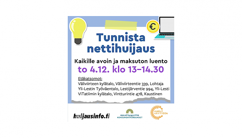 Tunnista nettihuijaus -luento ViTatiimin kylätalolla 4.12. klo 13-14.30.