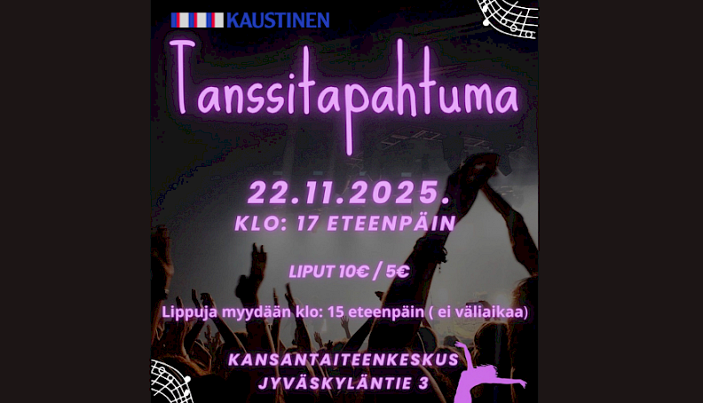 Vapaa-aikatoimen tanssiryhmien perinteinen syyskauden päättävä tanssitapahtuma järjestetään Kansantaiteenkeskuksessa lauantaina 22.11.2025 klo 17.00.